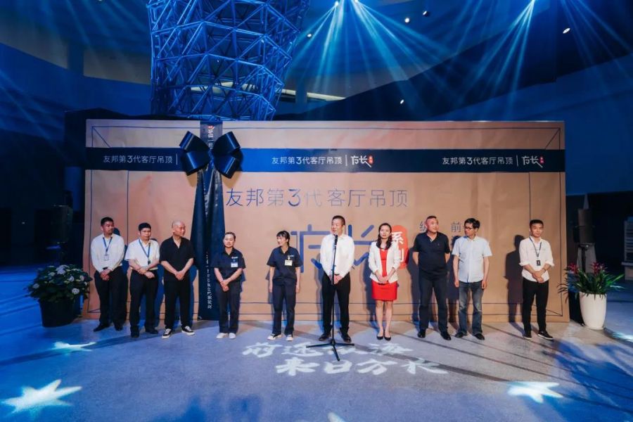 本次發布會時董特邀了12位特殊的嘉賓為新品揭幕,他們來自研發一線、生產一線、銷售終端、實際用戶。在線上線下十萬觀眾朋友們的見證下,美國杜邦王聰 女士、5K木子公司馬再良、筑家子公司余靖華、研發核心成員丁云斌、吳戴明、焦盟盟 、制造部大板車間班長張德慧、品質部翁美麗、經銷商代表黃偉清、楊敏、高琪,用戶代表阮水金在發布會現場共同拆開了一份神秘的禮盒。隨著禮盒的揭開,友邦第3代客廳吊頂“方長”系列終于露出了真容。
